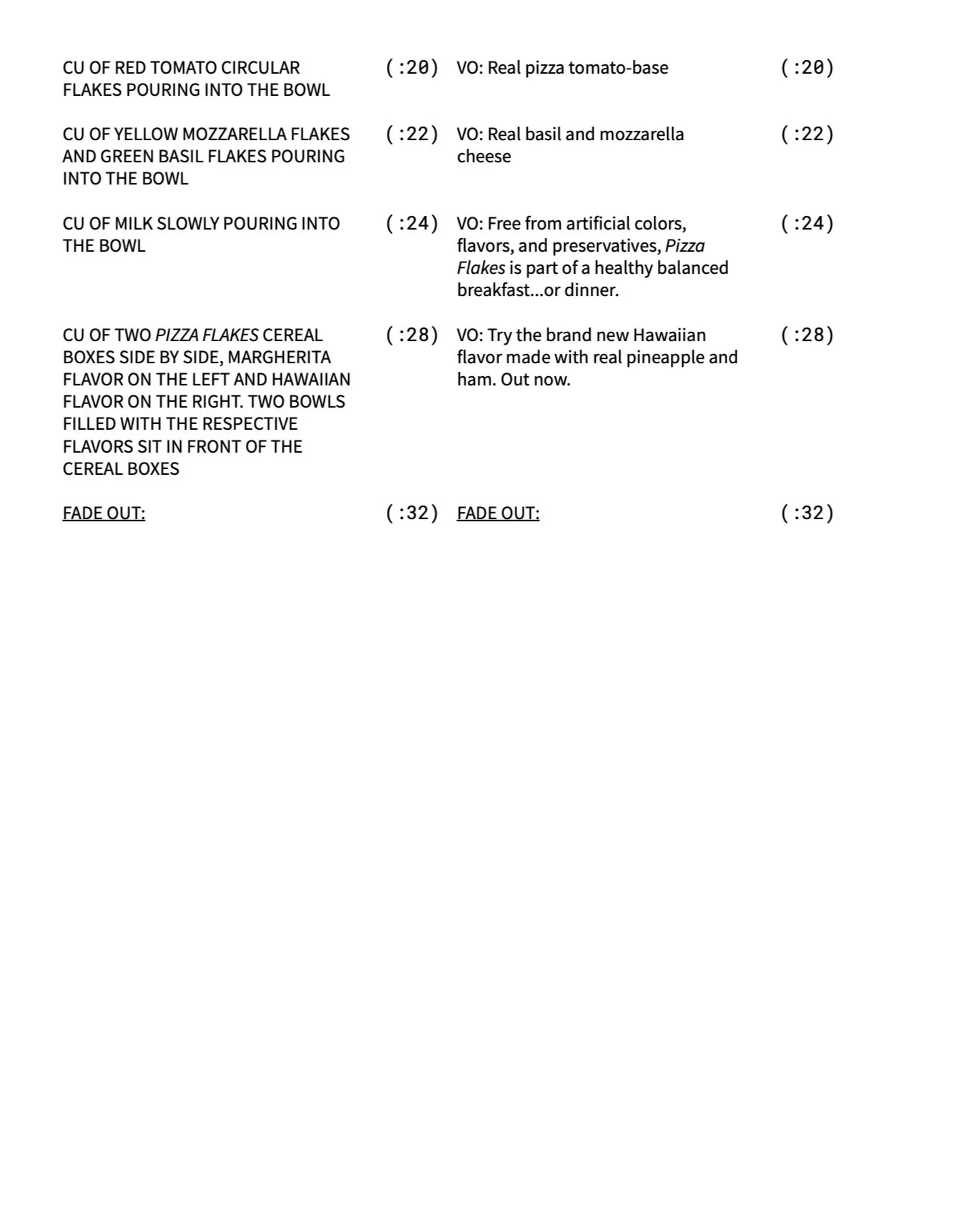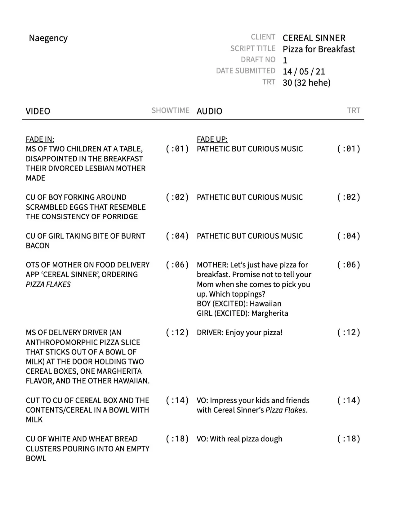 “Pizza for Breakfast” is a spec advert I wrote for under my fake advertising agency “Naegency,” for my fake client, “Cereal Sinners.” I randomly thought of something super gross — a cereal sin, if you will — and thought about selling it. Read more about it here. Read the script below.